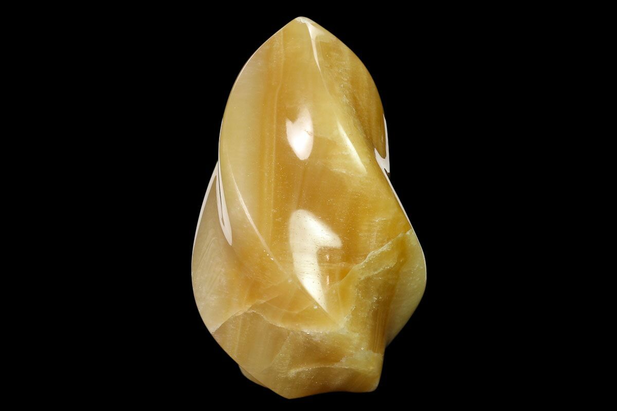 This is brown calcite from Madagascar which has been hand-polished into a "flame" shaped sculpture. This unique specimen is 5.3" tall and has multiple layers of calcite that vary between tan, white, brown and orange hues. The base has been cut to allow for aesthetic presentation.