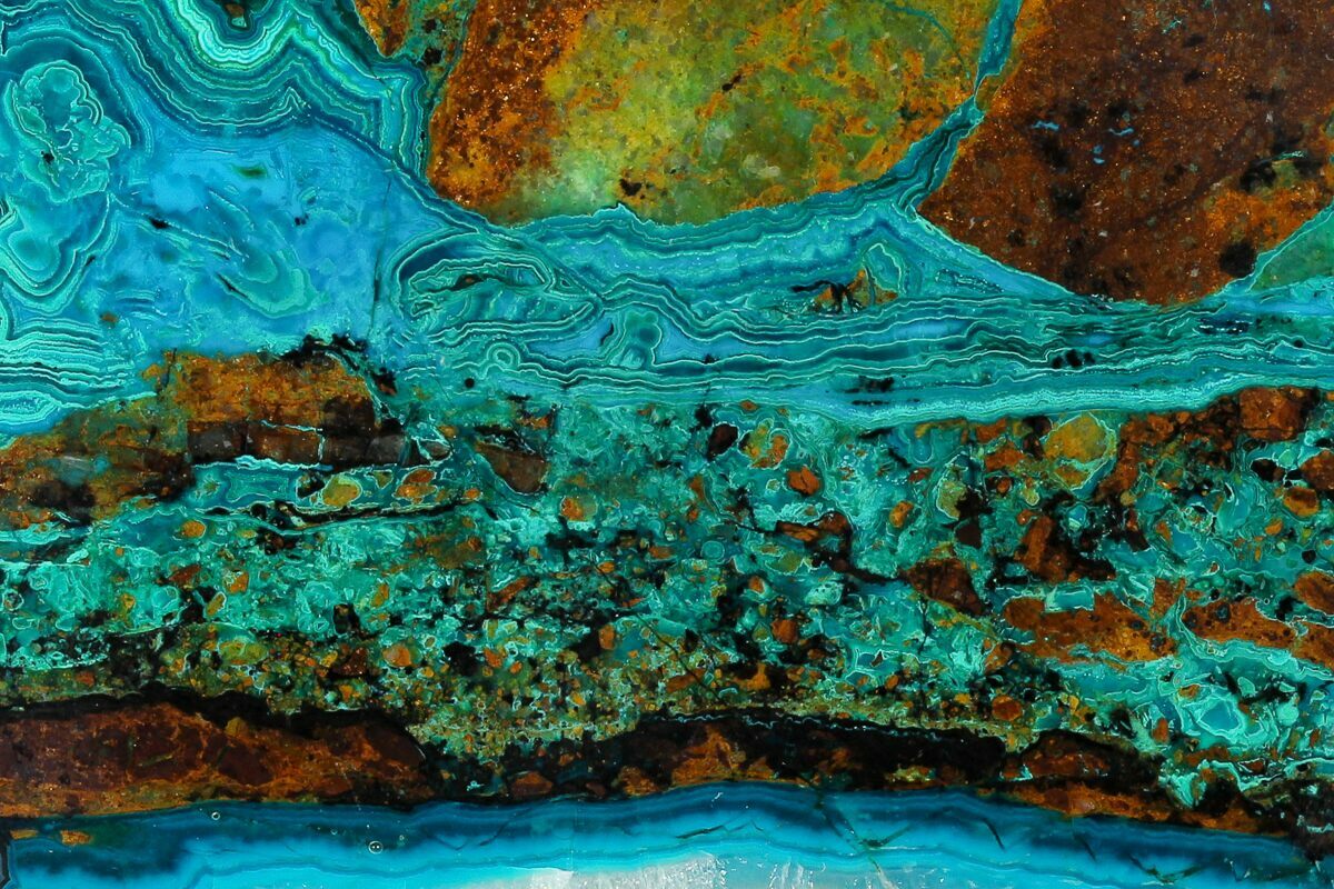 Although Bagdad Mine is one of the largest copper deposits in the world, it also produces absolutely breathtaking chrysocolla specimens. Our phenomenal specimens are typically a banded aggregation of chrysocolla, malachite, and quartz crystals. These minerals form in oxidation zones over the large copper deposits that are actively mined for the increasingly important metal. This means that many of these stunning minerals are thrown away in the overburden during the ore extraction process.
