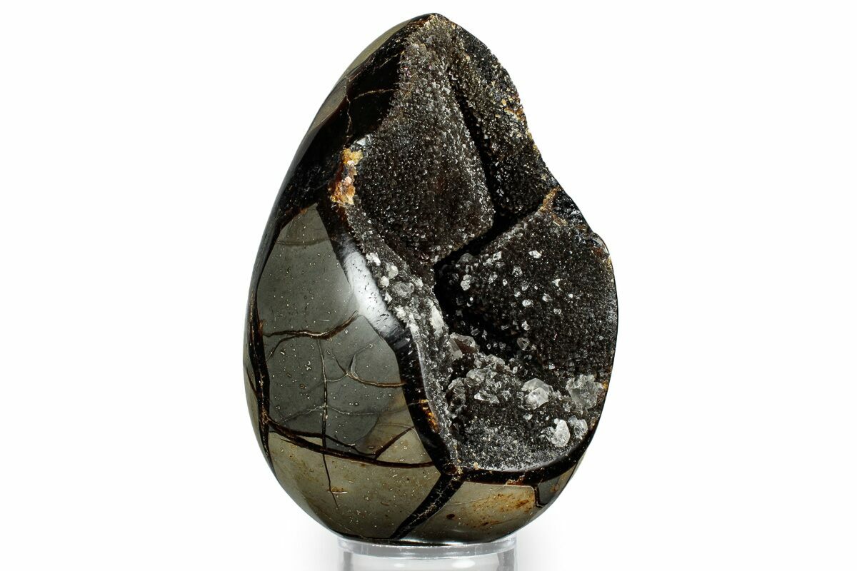 This is a gorgeous septarian "dragon egg" geode collected in the Betsiboka Region of Madagascar. The hollow cavity is full of beautiful, sparkling black & brown calcite crystals. It is a hollow septarian nodule which has been polished into an egg shape, and the natural cracked pattern of the septarian gives it the appearance of a dragons egg. A spectacular display piece which would look great in your home/office or make a great gift for the Game of Thrones enthusiast you know.