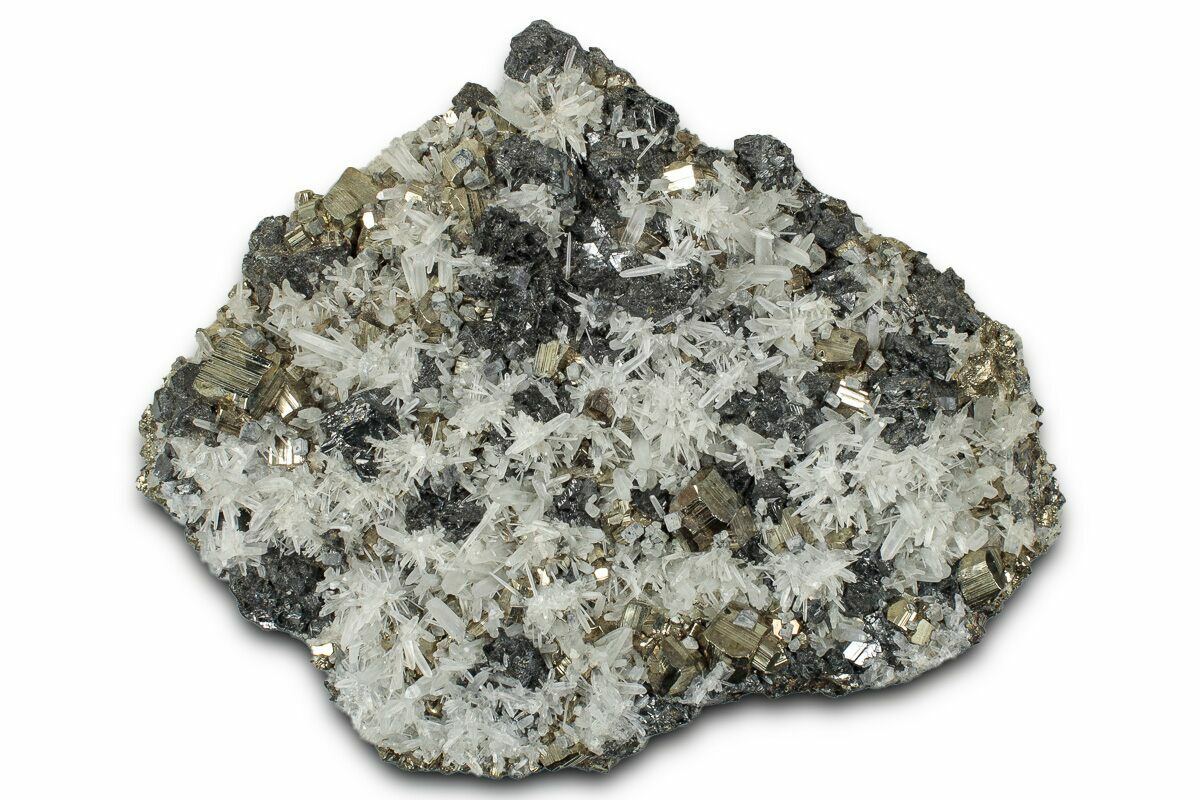 This is a beautiful specimen! It contains small clusters of gleaming pyrite and lustrous sphalerite crystals on a bed of sharp quartz crystals that vary significantly in size. It was collected from the Huanzala Mine in Peru and measures 5.3" wide. Small cubic galena crystals can be found peppered across the specimen as well.
