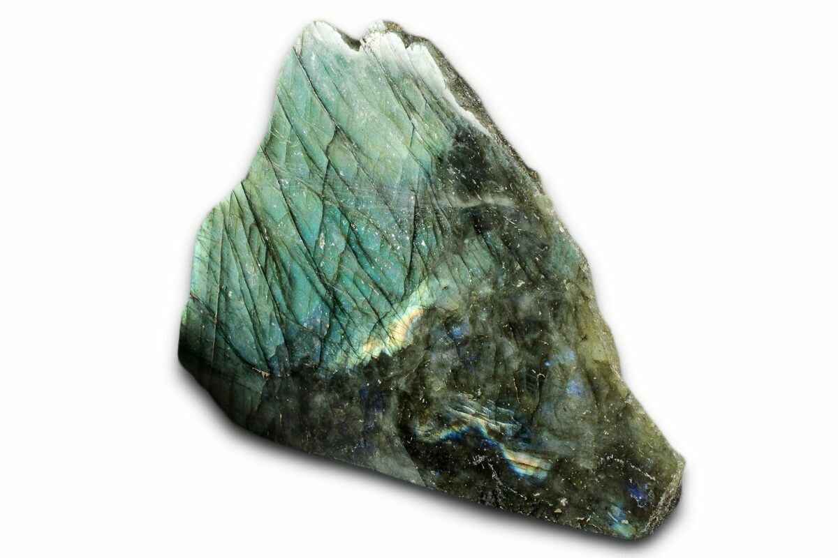 This is a brilliant 5.3" wide section of labradorite collected near Ampanihy, Madagascar. One face has been expertly polished to reveal the stone’s remarkable color play, while the base has been cut flat so it stands nicely on a hard surface. Vivid flashes of blue, green, and yellow shift and brighten as you rotate the piece, showcasing the dynamic labradorescence Madagascar is known for.