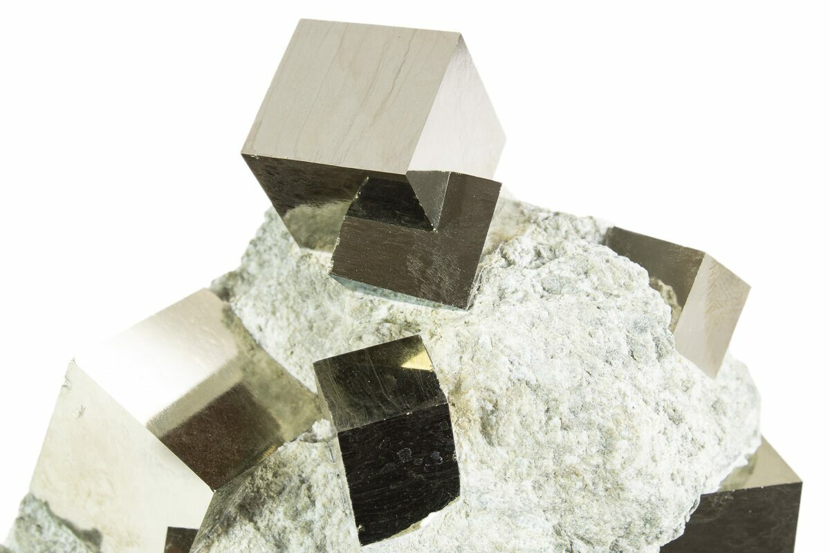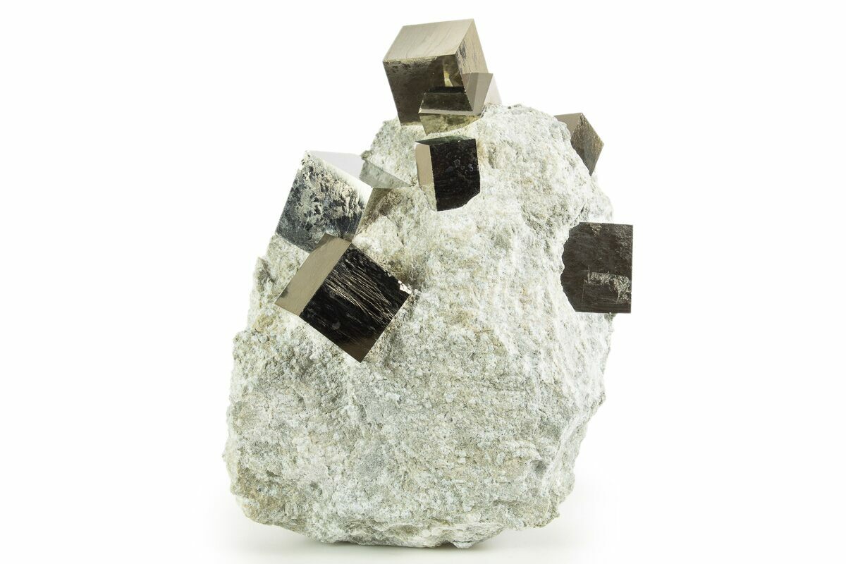 At first glance some people assume that these pyrite cubes are man-made, but the amazing thing is that they are natural! Pyrite from this location is famous for its beautiful shine, near-perfect cubic formation, and sculptural appearance. Because the matrix rock is soft, the cubes often come loose during collection. Care is taken during preparation to stabilize, repair, and make sure everything is remounted in its natural position: no specimens are composites. This means that nearly all of the pyrite cubes still in the rock from this locality have been remounted, and most clusters of multiple cubes have been stabilized.