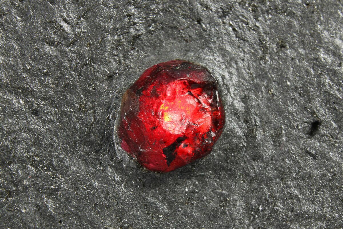 The garnets from this mine exhibit vibrant red coloration, especially when backlit. For this reason, garnet specimens that are left in the graphite matrix are often worked along both sides to allow light to pass through the garnet, primarily with the help of air-abrasives. Some garnets are removed from the matrix to be cut and polished for jewelry application.
