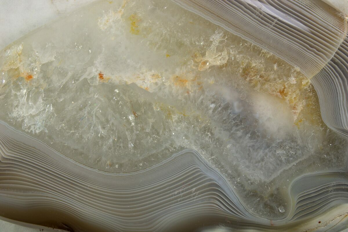 Agate is a variety of microcrystalline quartz (chalcedony) that displays translucence and, in some cases, banding. Agate primarily forms when silica-rich fluids fill pockets within rocks and/or fossils, depositing the silica along the walls of the rock. This process can result in banding patterns, as the compositions and impurities of these depositing fluids change over time. These banding patterns can either form as flat layers, creating linear patterns known as waterline agate, or as rounded layers, forming more common ring-like patterns. These patterns depend on the surfaces available for deposition.