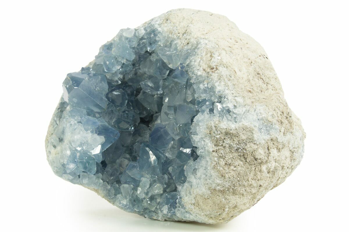 This is a striking celestine geode from Madagascar, measuring 5.4" wide and filled with a shimmering pocket of sky-blue crystals. The cavity is lined with small to medium-sized, glassy celestine blades that show excellent luster and impressive clarity, allowing light to pass through and illuminate their soft, ethereal color.