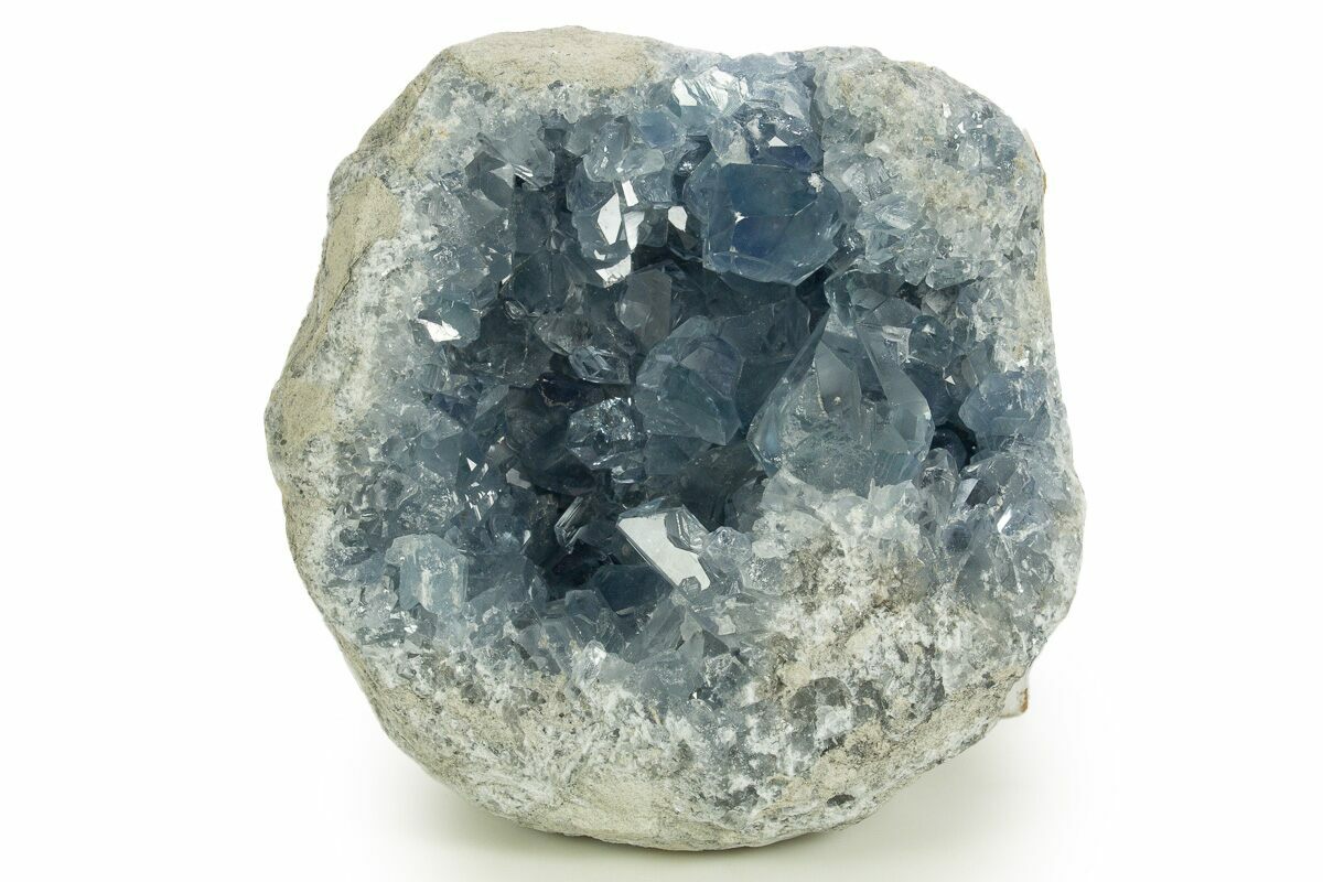 This is a striking celestine geode from Madagascar, measuring 5.5" wide and filled with a shimmering pocket of sky-blue crystals. The cavity is lined with small to medium-sized, glassy celestine blades that show excellent luster and impressive clarity, allowing light to pass through and illuminate their soft, ethereal color.