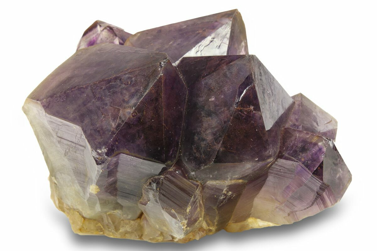 Amethyst clusters from the Democratic Republic of the Congo are renowned for their exceptionally dark, saturated purple color and their impressively large, well-formed crystals. Many Congolese clusters display deep violet to almost inky tones, often with excellent luster and sharp crystal terminations. Compared to amethyst from other localities, Congo material tends to have thicker, more robust crystal points that grow densely together, giving these clusters a bold, architectural presence that is especially prized for display.