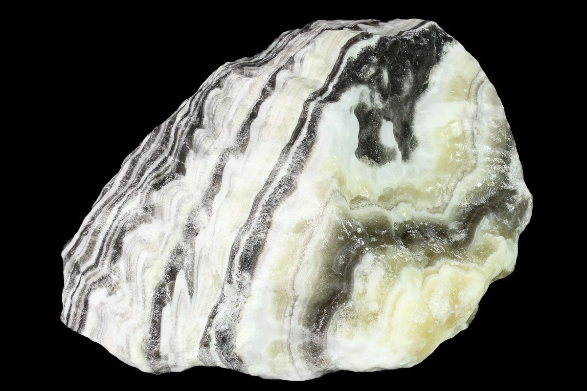 Zebra calcite, also known as "phantom calcite" or "butterfly calcite," is a striking variety of calcite characterized by bold, contrasting bands of black, white, cream, and brown. These layered patterns resemble the stripes of a zebra, giving the stone its name. Zebra calcite forms through the rhythmic precipitation of calcium carbonate in cavities or fractures within limestone or other host rocks. Over time, variations in mineral content, pressure, and temperature during the deposition process create alternating light and dark bands. The darker layers typically contain inclusions of manganese or other minerals, while the lighter bands are composed of purer calcite.