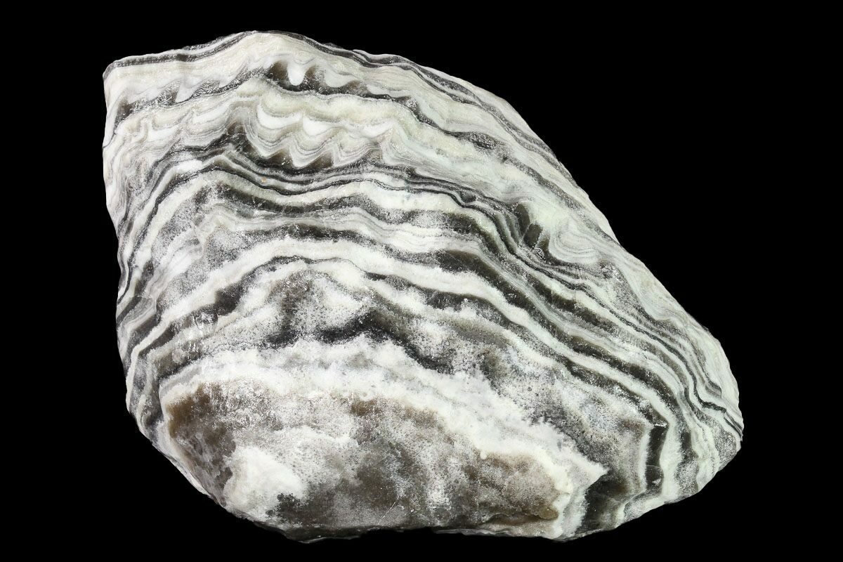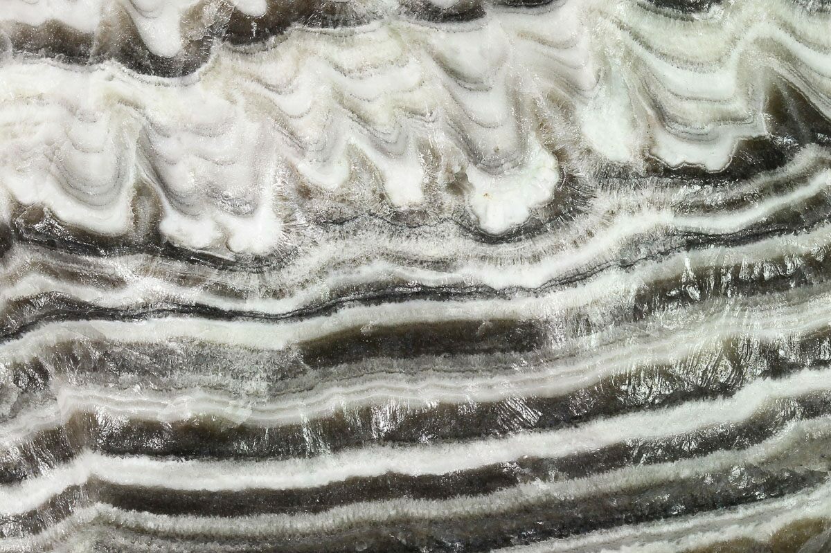 This is a 5.5" wide, free-standing banded zebra calcite section. It features alternating bands of black, brown, white and golden calcite/aragonite. It can be displayed in multiple orientations.
