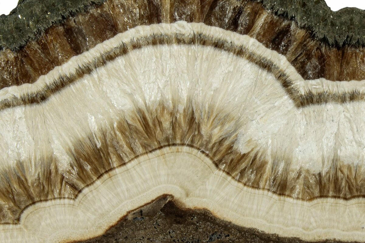 This is a beautiful, polished barite and marcasite slab collected from the Lubin Mine in Poland. The barite displays coloration that ranges between brown, white, and beige, depending on conditions and mineral compositions present during formation. The silver-gold colored marcasite can be noted by its reflective properties. Its iridescent globular exterior formations can be found on the edges.