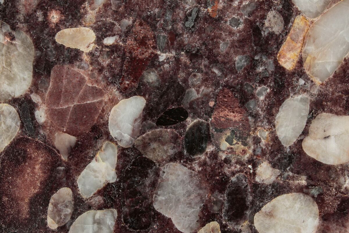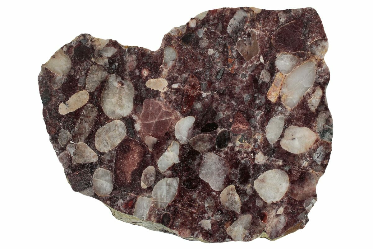 This unique stone is composed primarily of white quartzite or chert cemented together with a mixture of jasper, hematite, and other pebbles in shades of red, brown, gray, and black. The contrasting clasts were naturally fused together by ancient geological processes more than a billion years ago, creating a vivid, polished appearance that makes each piece entirely one-of-a-kind.