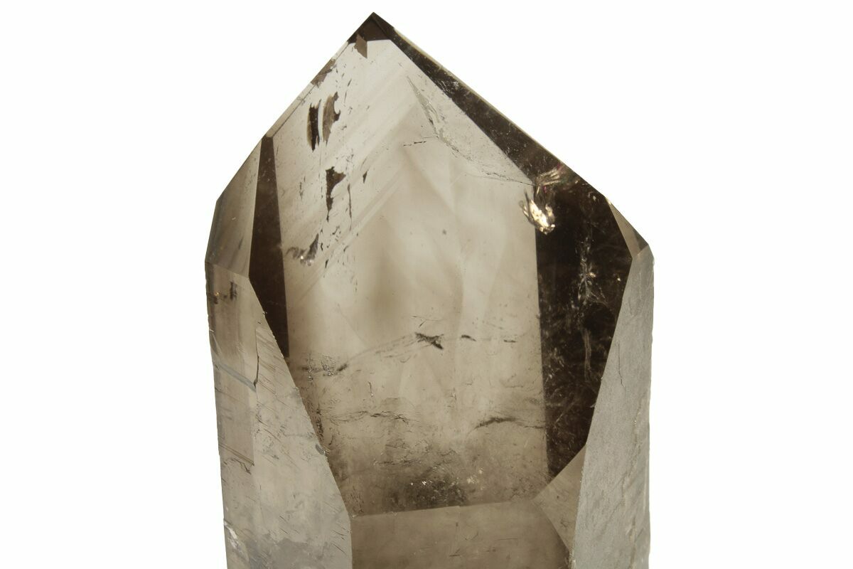 This is a dark brown, smoky quartz crystal from Brazil. The crystal is primarily damage free and has beautiful smoky coloration. This crystal has a mixture of polished and natural faces for easier viewing of inclusions and overall aesthetic enhancement. It has not been heated or treated to change the natural color. This specimen is accompanied by a custom metal display stand.