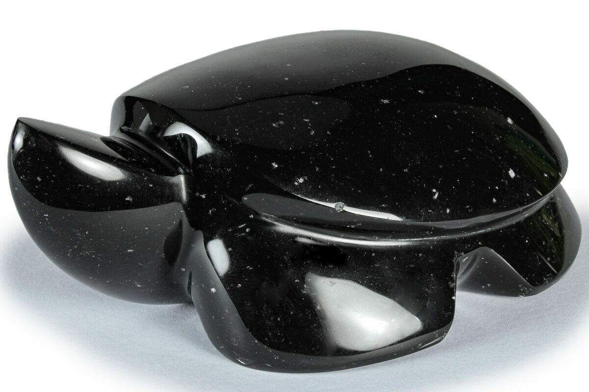 This is a polished turtle sculpture carved from a massive formation of black basalt mined in California. This basalt turtle measures 5.6 inches long and has been polished to a glossy finish.