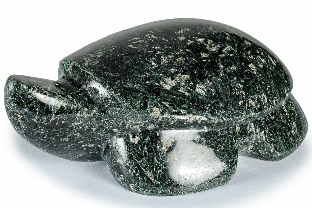 This is a polished turtle sculpture carved from a massive formation of green actinolite mined in California. This beautiful actinolite turtle measures 5.6 inches long and has been polished to a glossy finish.