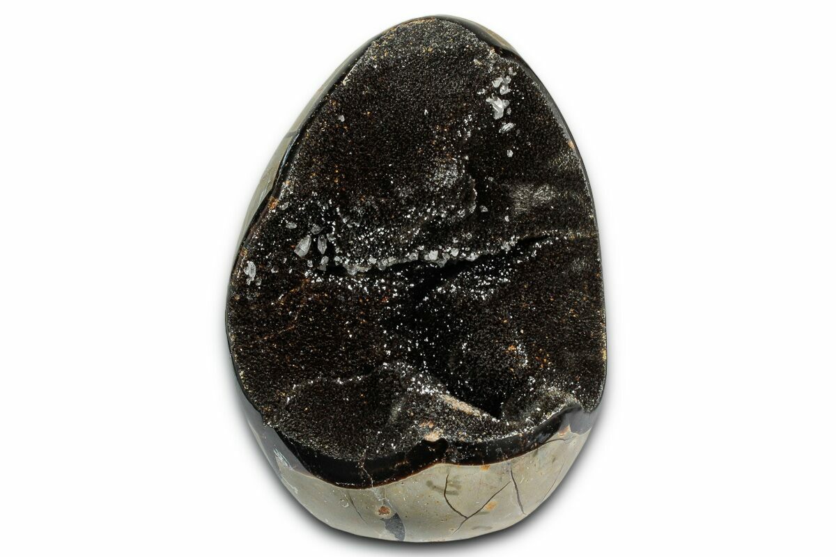 This is a unique polished septarian geode collected in the Betsiboka Region of Madagascar. The hollow cavity is full of beautiful, sparkling black/brown calcite and colorless barite crystals. It is a hollow septarian nodule, which has been polished into a sculpture with the natural, cracked pattern of the septarian giving it a very interesting appearance. The base has been cut flat so that it stands up on it's own.