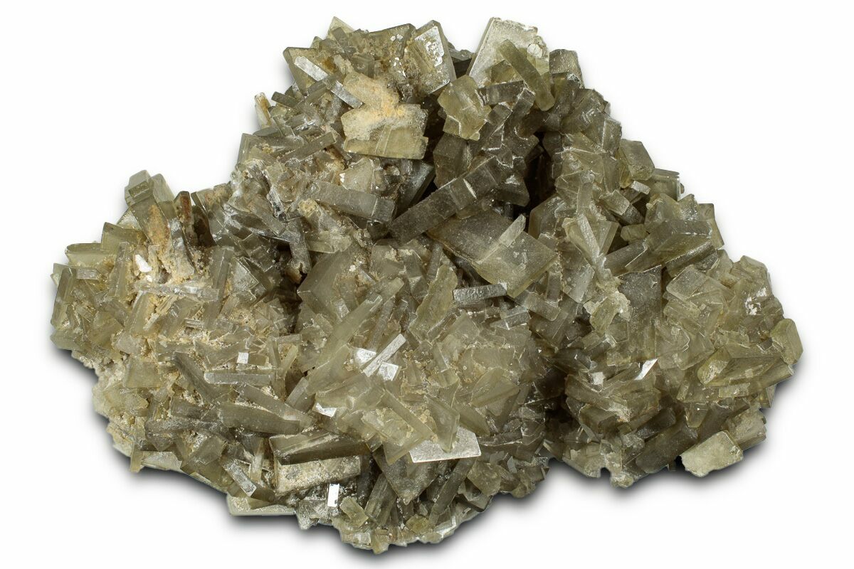 This specimen features clusters of gray-green to even slightly yellow tabular barite crystals, collected in Peru. The barite is beautifully formed, mostly damage free, and displays interior phantoms.