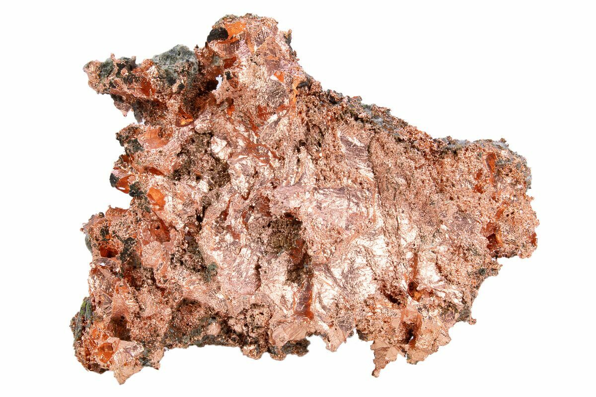 Native copper occurs rarely as isometric cubic and octahedral crystals, but more typically as irregular masses and fracture fillings. It has a reddish, orangish, and/or brownish color on fresh surfaces, but typically is weathered and coated with a green tarnish of copper carbonate.