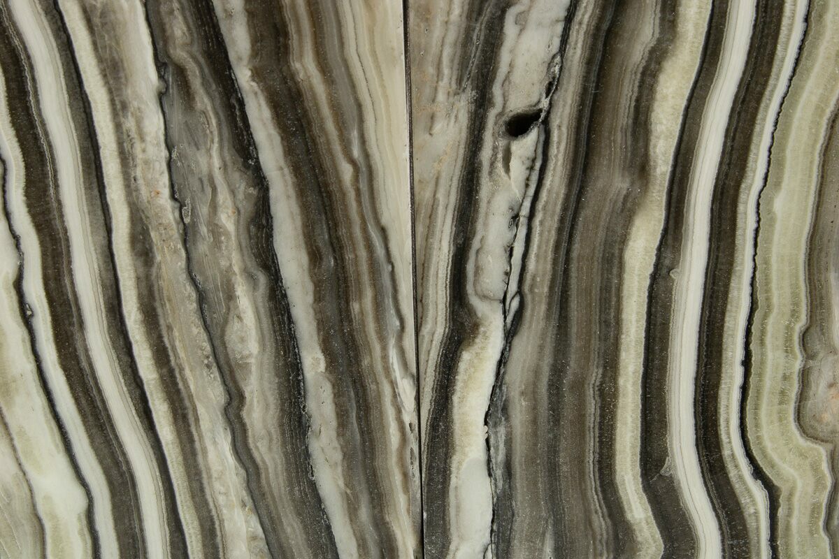 Zebra calcite, also known as "phantom calcite" or "butterfly calcite," is a striking variety of calcite characterized by bold, contrasting bands of black, white, cream, and brown. These layered patterns resemble the stripes of a zebra, giving the stone its name. Zebra calcite forms through the rhythmic precipitation of calcium carbonate in cavities or fractures within limestone or other host rocks. Over time, variations in mineral content, pressure, and temperature during the deposition process create alternating light and dark bands. The darker layers typically contain inclusions of manganese or other minerals, while the lighter bands are composed of purer calcite.
