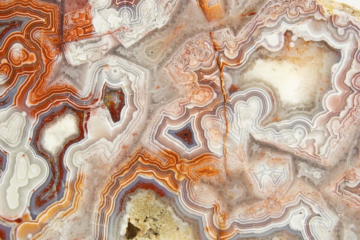 Crazy lace agate, also known as Mexican Agate, is a unique banded agate that comes from Chihuahua, Mexico. It gets its name from complex, lacy patterns swirling through the stone. Colors can vary from cream and orange to red, and are caused by iron and aluminum inclusions in the agate.