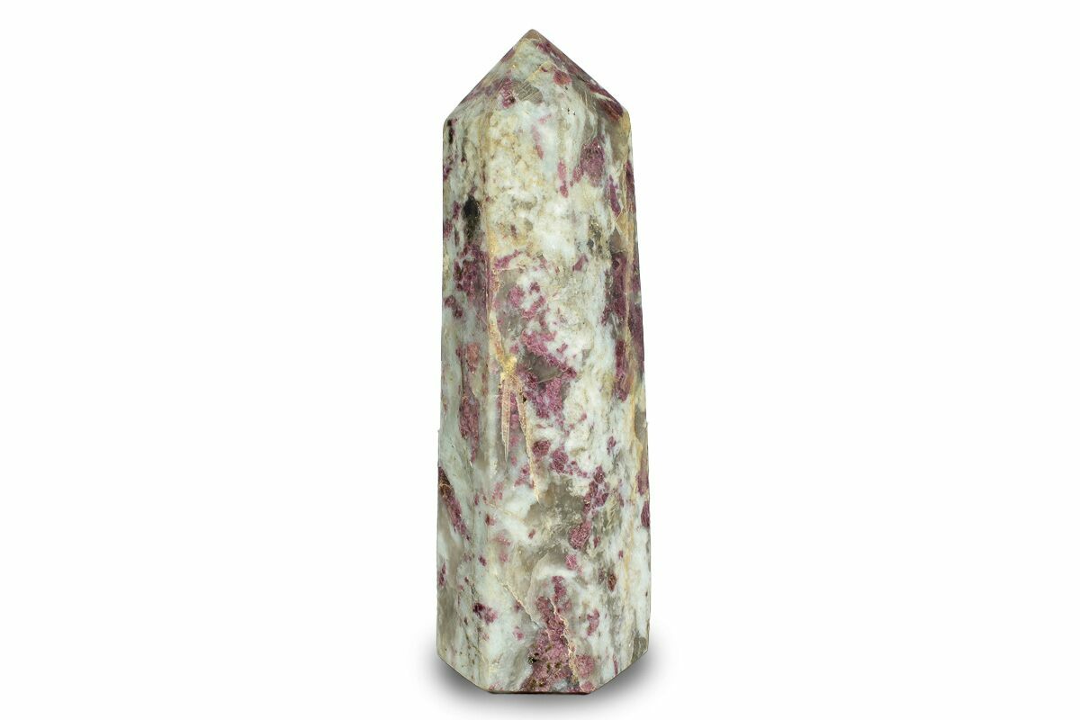 This is a 5.6" tall, hand polished tower made from magenta colored tourmaline (rubellite) in quartz. This rock formation was collected from Madagascar.