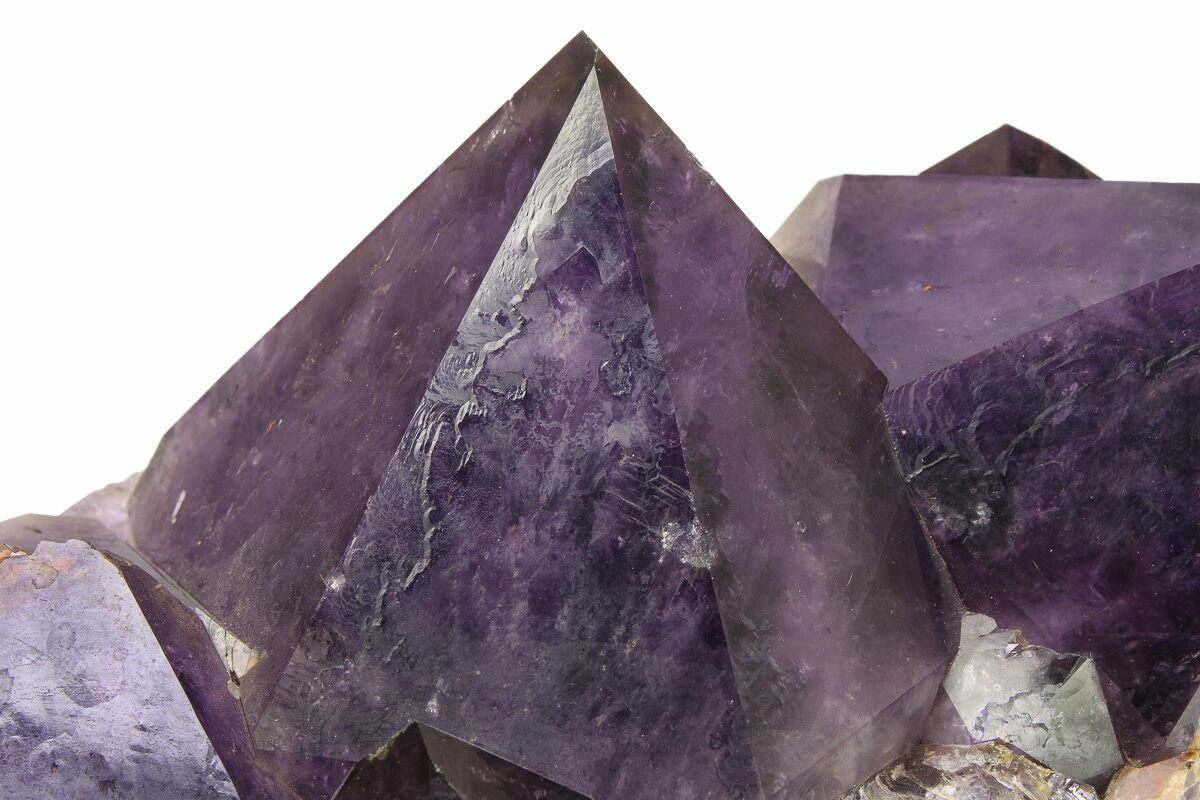 Amethyst clusters from the Democratic Republic of the Congo are renowned for their exceptionally dark, saturated purple color and their impressively large, well-formed crystals. Many Congolese clusters display deep violet to almost inky tones, often with excellent luster and sharp crystal terminations. Compared to amethyst from other localities, Congo material tends to have thicker, more robust crystal points that grow densely together, giving these clusters a bold, architectural presence that is especially prized for display.