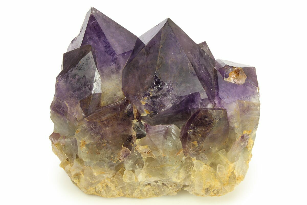 This is a stunning, 5.65" wide amethyst crystal cluster with beautiful purple coloration and exceptional luster, collected from the Democratic Republic of the Congo. These crystals have undergone no color treatment or polishing. The orange-red color across some of the crystals can be attributed to iron oxidation.