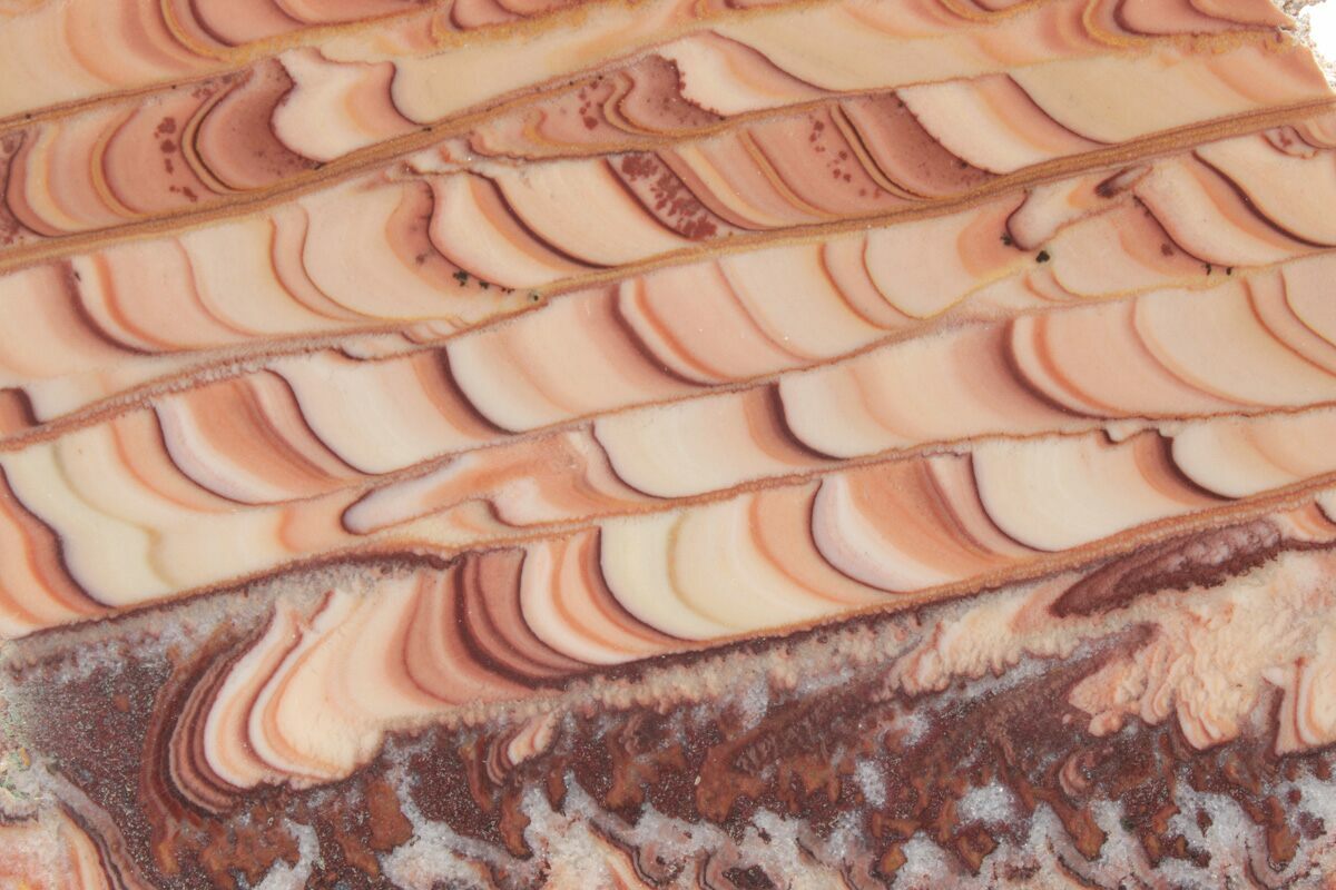 Rolling Hills Dolomite, often marketed as Wave Dolomite, is prized for its flowing, wave-like bands that sweep across the stone in warm tans, soft pinks, creams, and rich reddish tones. These rhythmic layers formed as successive sheets of fine sediments—rich in carbonates and iron minerals—were repeatedly deposited, compacted, and subtly deformed over geologic time. The gentle curvature of the bands isn’t random; it reflects the directional pressures and natural movement within the sedimentary layers as they lithified, giving each piece the appearance of a miniature desert landscape or rolling hillside frozen in stone.