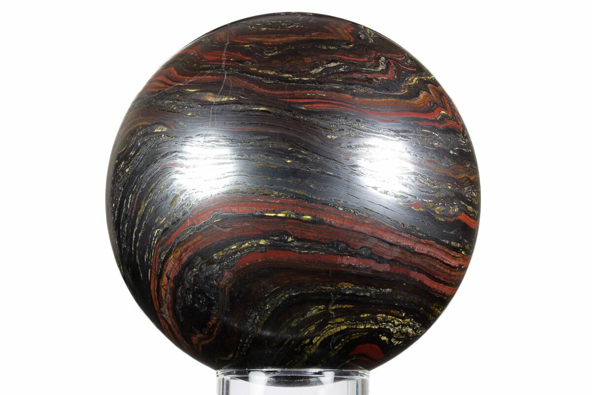 This is a breathtaking, high-quality, 5.7" wide polished sphere of 3.02 billion year old tiger iron, collected from the Ord Ranges in Western Australia. It displays beautifully on the acrylic ring display base that is included with the specimen.