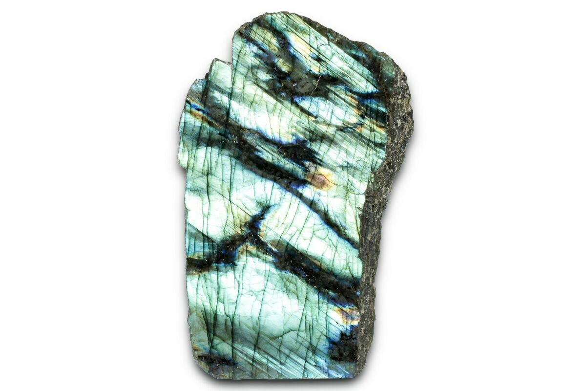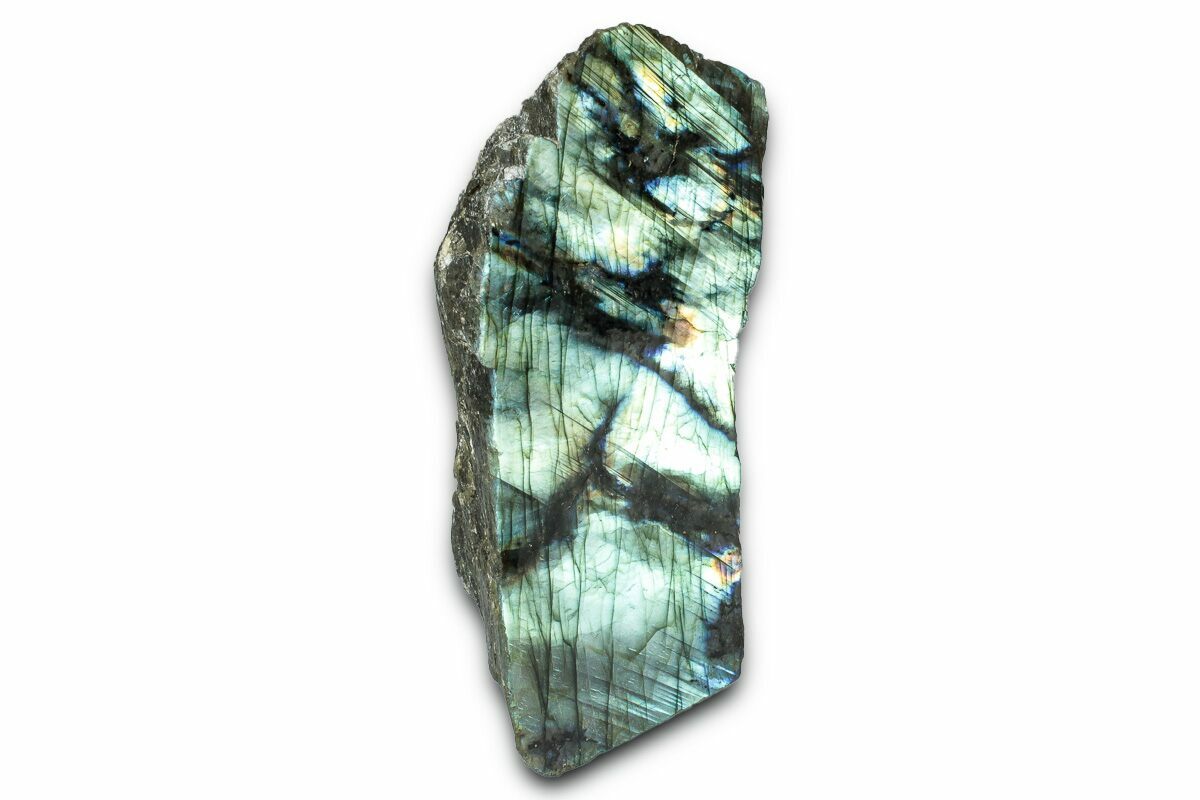 This is a brilliant 5.7" tall section of labradorite collected near Ampanihy, Madagascar. One face has been expertly polished to reveal the stone’s remarkable color play, while the base has been cut flat so it stands nicely on a hard surface. Vivid flashes of blue, green, and yellow shift and brighten as you rotate the piece, showcasing the dynamic labradorescence Madagascar is known for.