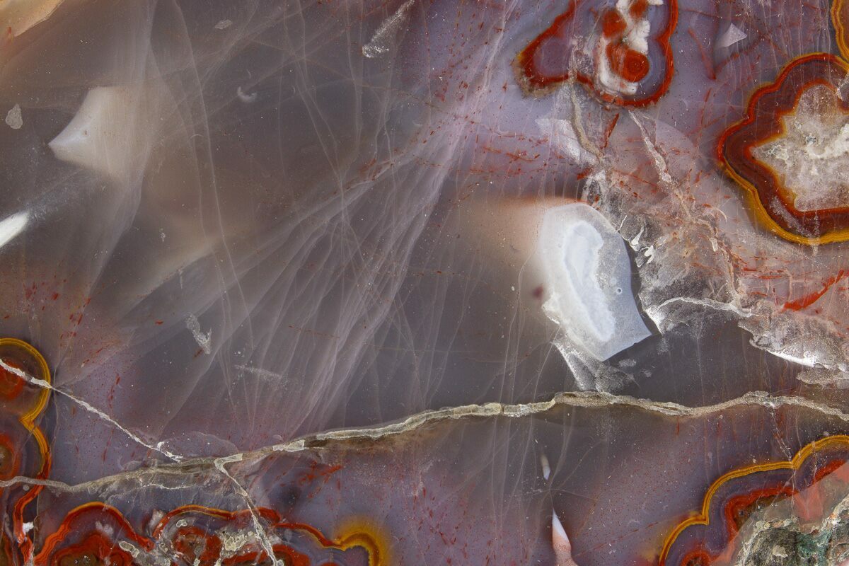 Agate is a variety of microcrystalline quartz (chalcedony) that displays translucence and, in some cases, banding. Agate primarily forms when silica-rich fluids fill pockets within rocks and/or fossils, depositing the silica along the walls of the rock. This process can result in banding patterns, as the compositions and impurities of these depositing fluids change over time. These banding patterns can either form as flat layers, creating linear patterns known as waterline agate, or as rounded layers, forming more common ring-like patterns. These patterns depend on the surfaces available for deposition.