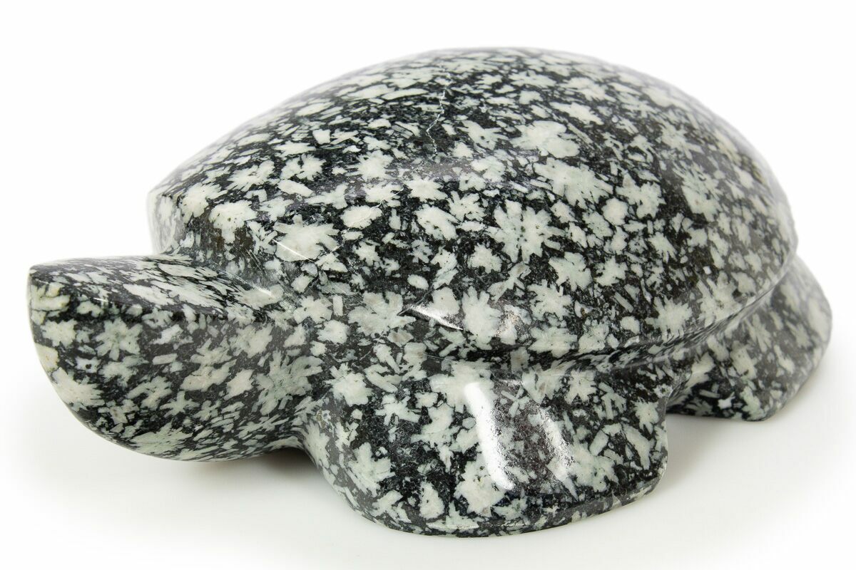 This is a beautiful polished turtle sculpture carved from a piece of Chinese writing rock. This big guy measures 5.8 inches long and the glossy polish really brings out the intricate details of the feldspar.