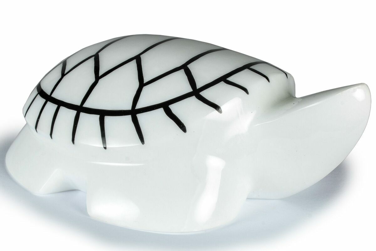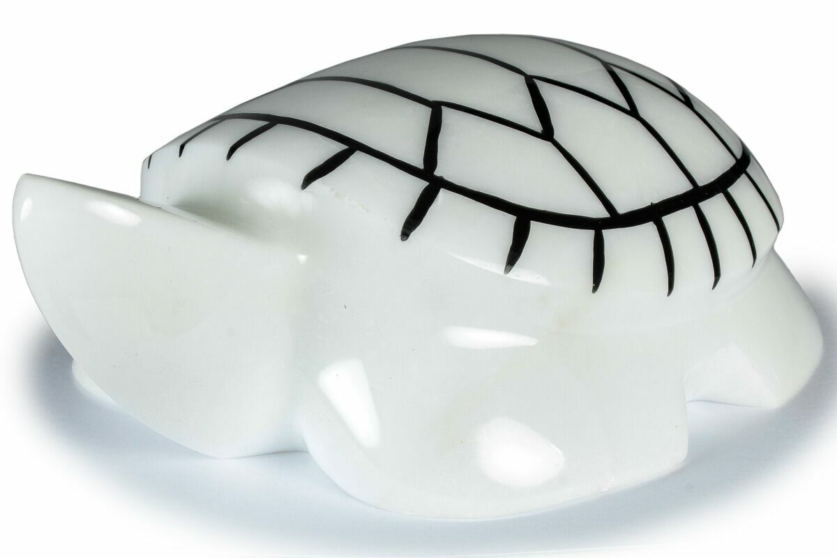 This is a 5.8" long turtle sculpted from white marble collected in the Philippines. The marble has been meticulously shaped and polished to create this unique piece. Grooves were cut into the "shell" and a black epoxy was applied to give the shell scutes.