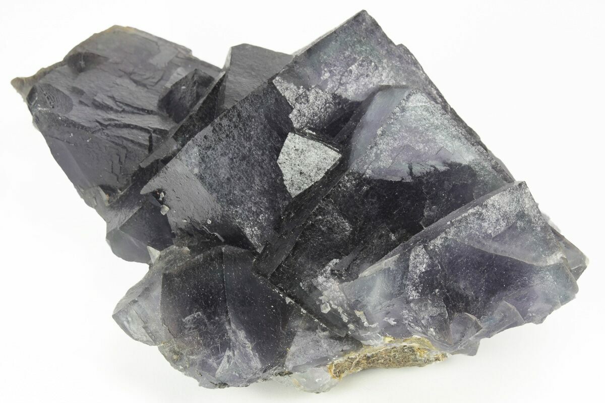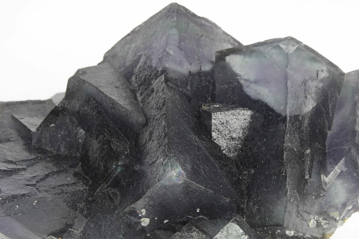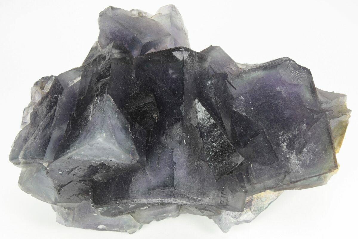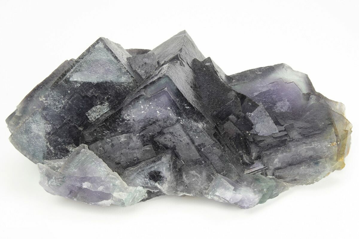 This is a stunning cluster of cubic fluorite crystals with purple outer phantoms, underlying blue-green phantoms, and gorgeous purple cores. It was collected from the Yaogangxian Mine in the Hunan Province of China. A unique characteristic of this fluorite is that under short-wave ultraviolet light, the crystals exhibits a purple fluorescence throughout, with vibrant fluorescent phantoms along the edges just beneath the exterior, and spots of red-orange fluorescence that are likely caused by inclusions or impurities.