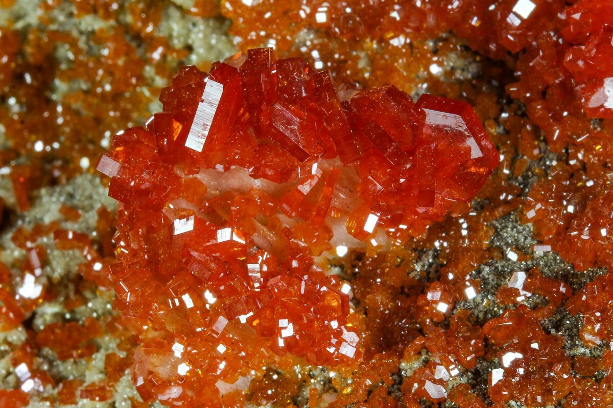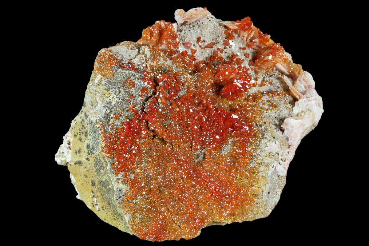 Vanadinite from Morocco is world-famous for producing some of the finest red crystal specimens on the planet. In the arid hills surrounding Mibladen and Taouz, vanadinite forms as vibrant clusters of hexagonal prisms, often with a deep crimson to orange-red color that seems to glow against the pale desert matrix. These crystals typically develop in dense groups, coating barite blades or covering weathered limestone with dazzling, glassy faces and sharp geometric symmetry. The dryness of the region and the slow oxidation of ancient lead deposits create the perfect geochemical environment for vanadinite to grow with exceptional clarity, luster, and intensity of color. Moroccan vanadinite is highly prized by collectors for its bold aesthetics, architectural crystal formations, and the consistent quality that has made these localities the global benchmark for the species.