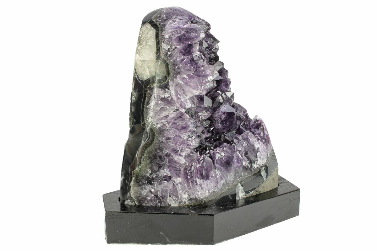 This is a 5.85" tall, lustrous, purple amethyst crystal cluster from the world famous amethyst mines near Artigas, Uruguay. The edges of the geode have been polished.