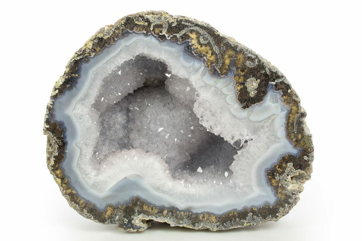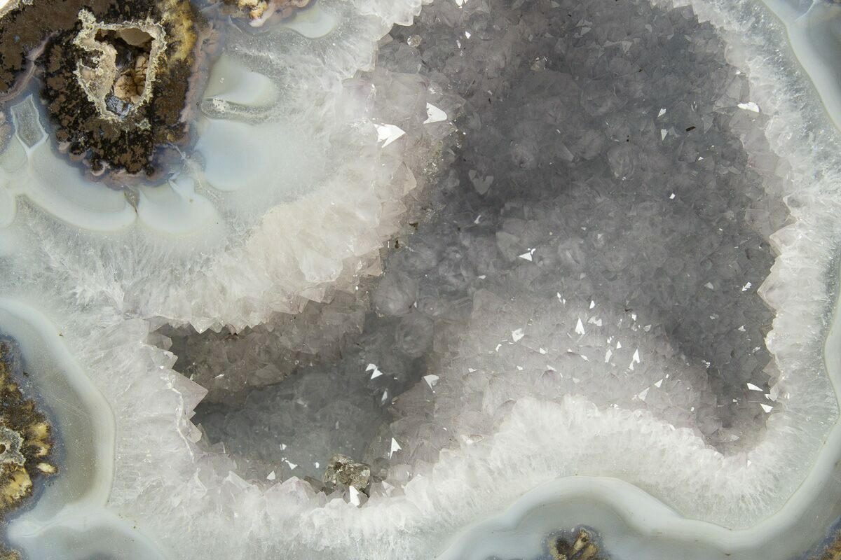 This is a beautiful 5.85" wide "coconut geode" from Chihuahua, Mexico. This geode is filled with a thin layer of banded agate and a quartz and amethyst crystal encrusted cavity. The open faces have been cut flat and polished to a glossy finish. Both halves of this geode are included and each is accompanied by an acrylic display stand.