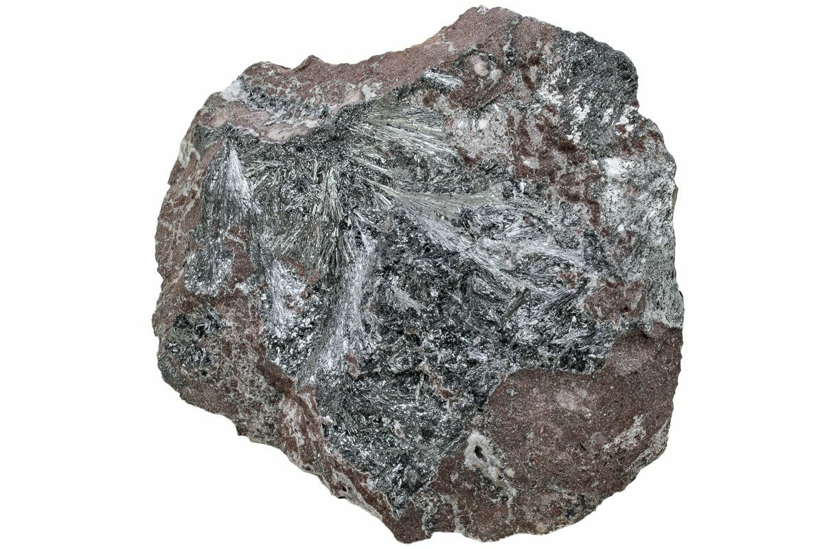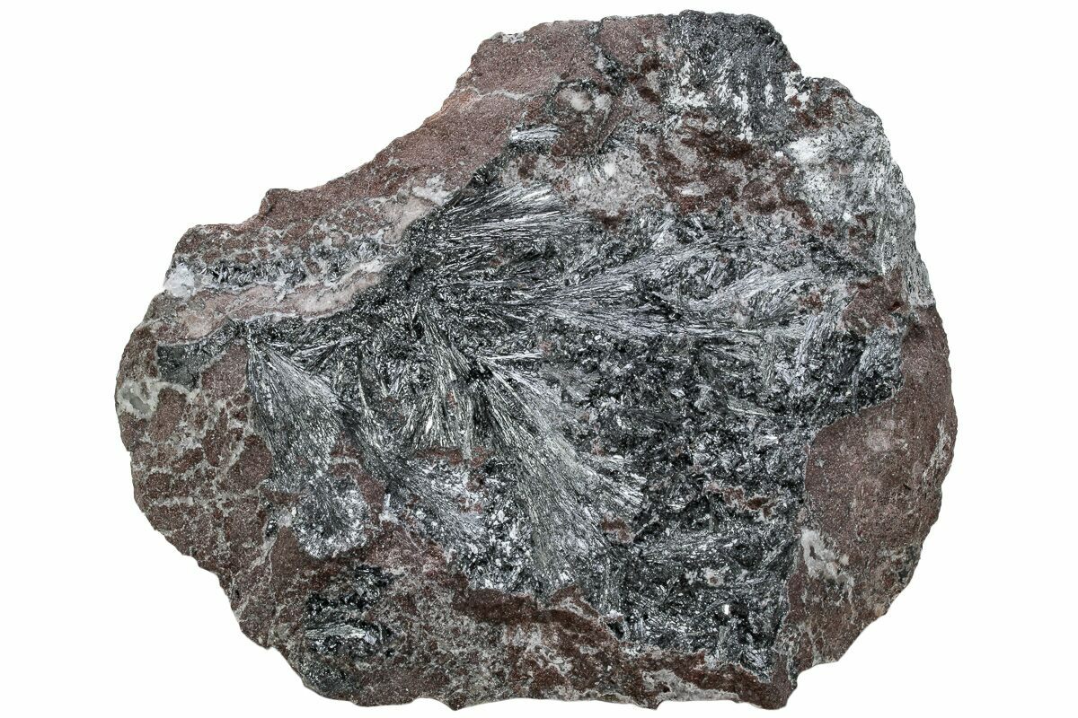 This is a lustrous formation of radiating silver pyrolusite from Morocco. The specimen features several radiating sprays of shiny, metallic crystals in a red-brown, iron-rich matrix.