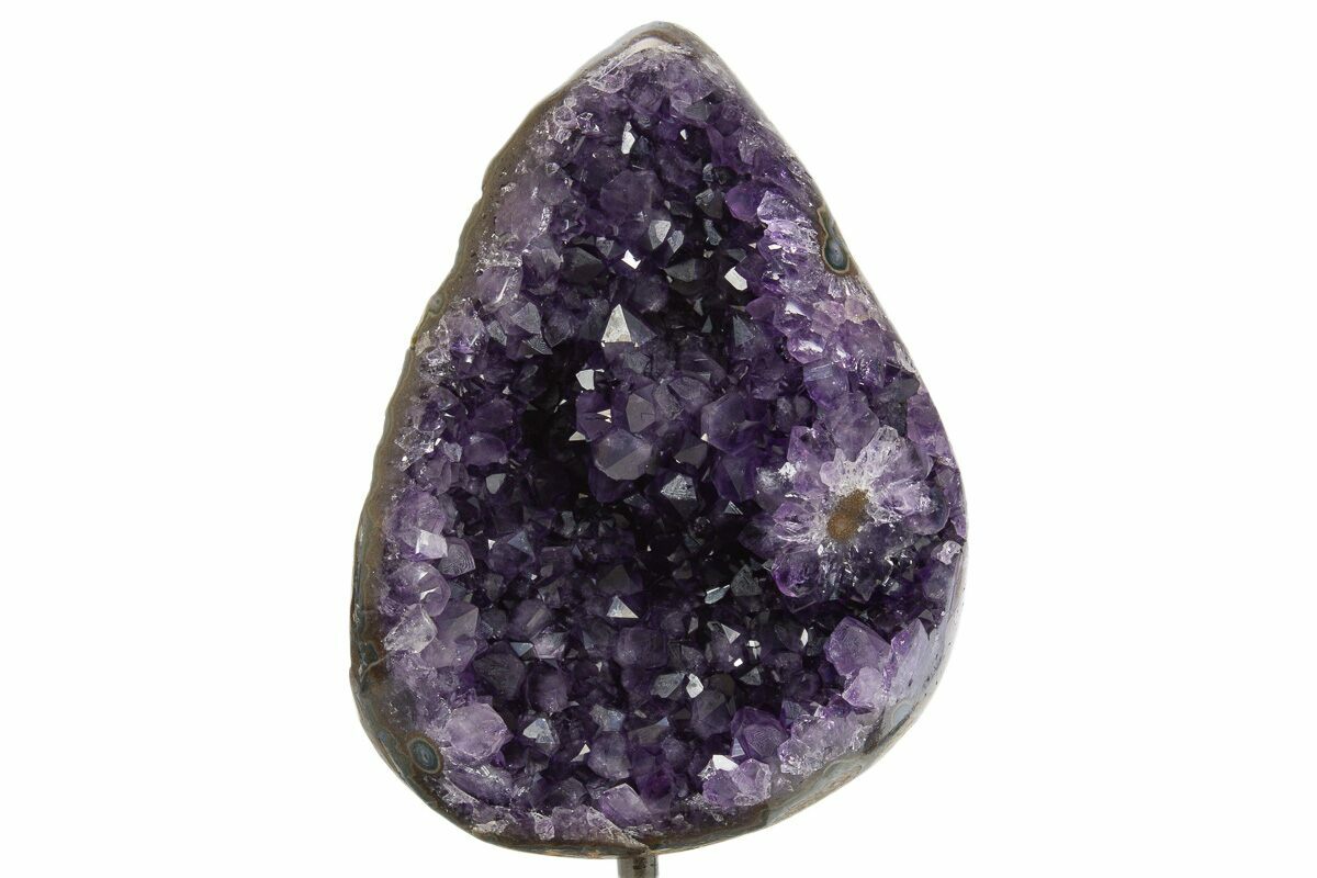 This is a gorgeous, dark amethyst crystal geode that has been mounted to a metal stand. The cluster itself is 5.9" tall by 4.3" wide. Including the stand, the specimen is 8" tall. The outer edge of the geode has been polished, allowing for display of the various crystal growth layers.