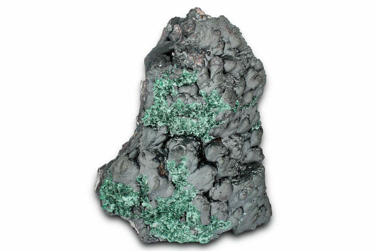 This spectacular specimen features fibrous malachite pseudomorphs after barite, formed over a lustrous, botryoidal formation of goethite. Areas exhibiting natural iridescence can be found along the periphery and small clear barite crystals are peppered across the malachite. It was collected in Africa, though the specific location is unknown.