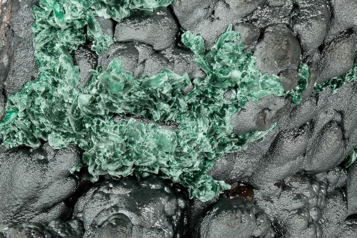 Malachite is an intense green copper-based mineral that can be found in a wide variety of forms. Malachite can grow in botryoidal masses, stalactitic formations, and reniform formations, typically as a tight cluster of fanning fibrous needles that make up a seemingly solid mass. As layers continue to stack during formation, banded patterns can sometimes begin to take shape, explaining the rings in all shades of green seen on most polished malachite specimens.