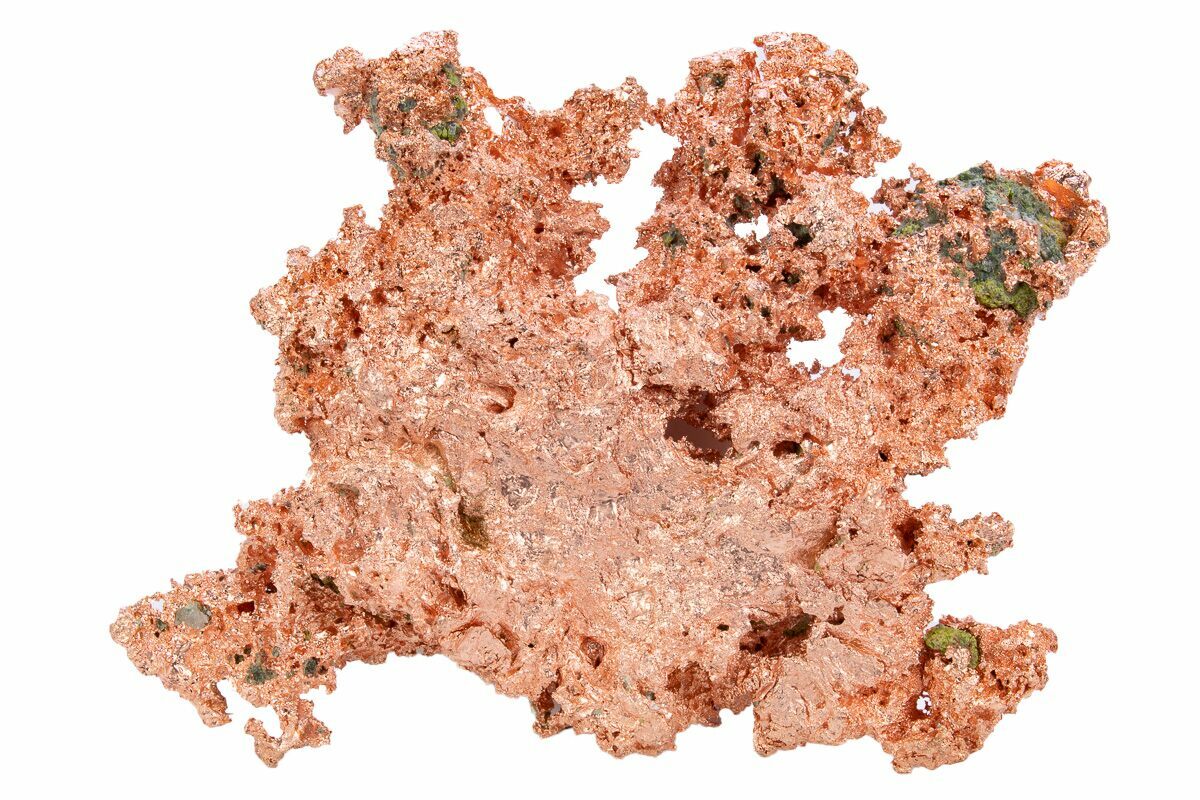 Native copper occurs rarely as isometric cubic and octahedral crystals, but more typically as irregular masses and fracture fillings. It has a reddish, orangish, and/or brownish color on fresh surfaces, but typically is weathered and coated with a green tarnish of copper carbonate.