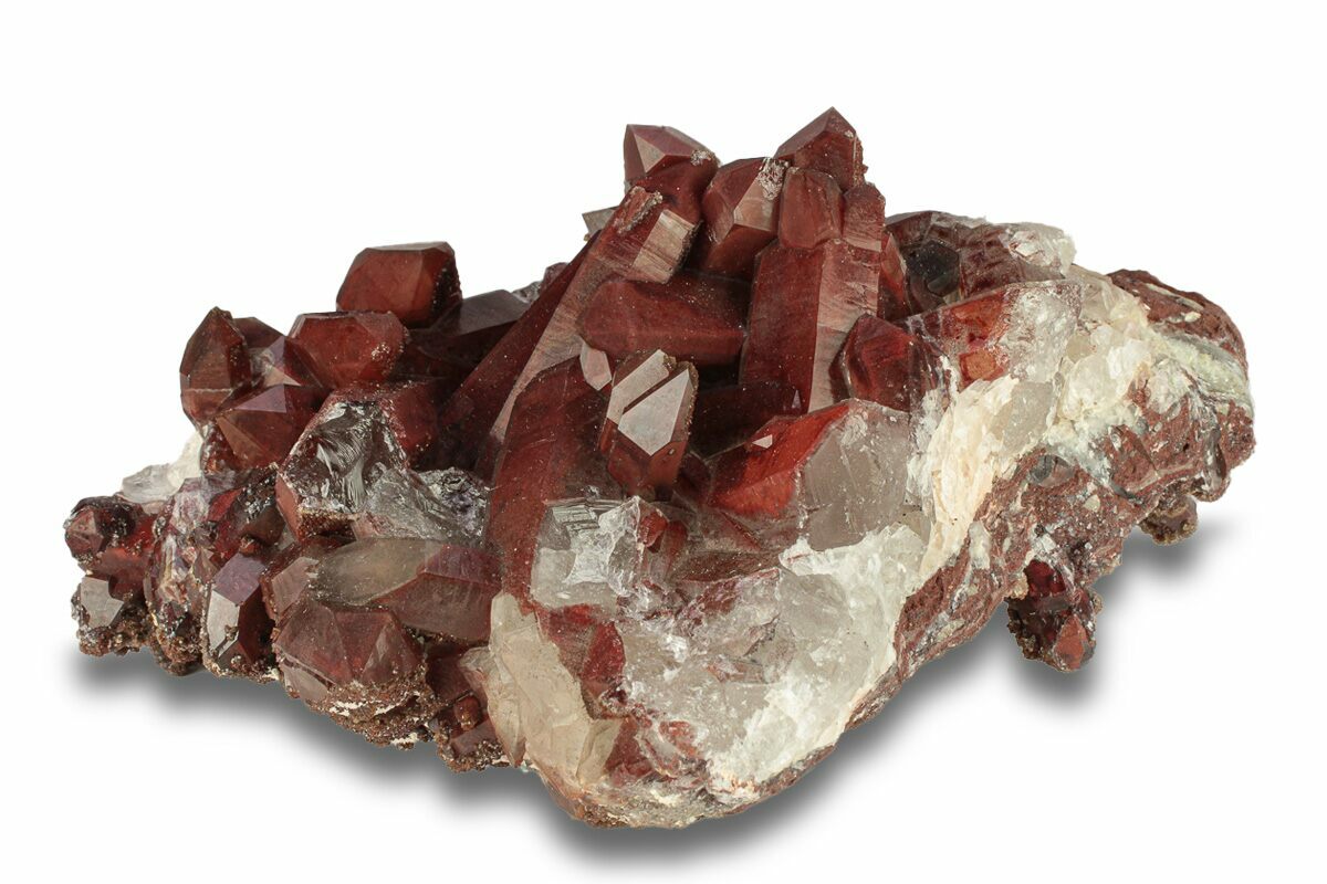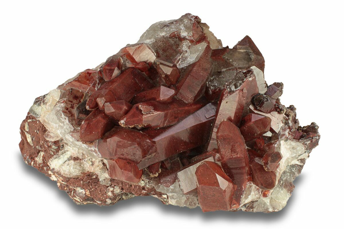 This is a top-quality cluster of natural red quartz crystals from Tinejdad, Morocco. The red coloration is due to iron oxidation across the exterior of the crystals, as well as inclusions through the crystals.