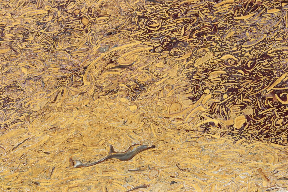 Miriam Jasper is also known by the trade names "Arabic Script Jasper", "Elephant Skin Jasper", "Calligraphy Stone" or "Coquina Jasper". It is a fossiliferous sedimentary rock mined from the Himalayan Mountains of India. This stone began as a silica-rich mud packed with shell fragments, known as coquina—a term that comes from the Spanish word for cockleshells or shellfish. Coquinas form in high-energy marine environments, like coastlines, where waves and currents wear down, break, and sort the shells. Over time, these fragments fossilized, and the silica-rich mud transformed into jasper. The vibrant orange color comes from iron oxidation.