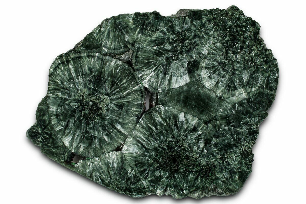 This is a cross-sectional cut slab of spherical seraphinite aggregations, collected from the Korshunovkiy mine (Korshunovskoye Iron Skarn) in Siberia, Russia. It has been polished to a glossy finish on one side, revealing the chatoyant nature of this stunning mineral.