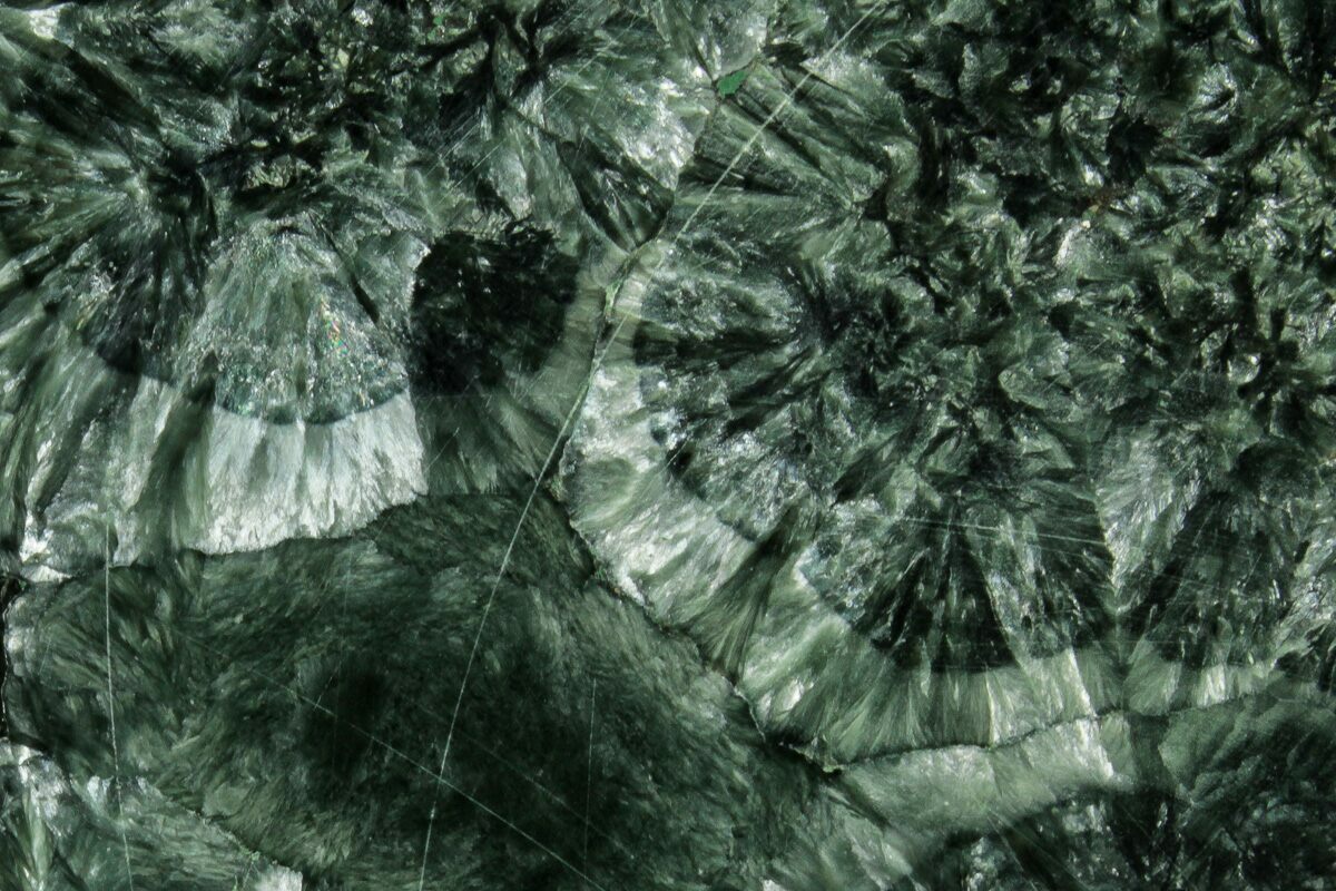 Seraphinite is a trade name for a particular dark green, feathery form of the mineral clinochlore. This material is mined exclusively from the Korshunovskoye iron skarn deposit in the Irkutskaya Oblast of Eastern Siberia. Seraphinite is named after the biblical seraphs or seraphim angels: it apparently acquired its name due to its resemblance to feathers, caused by its chatoyancy.