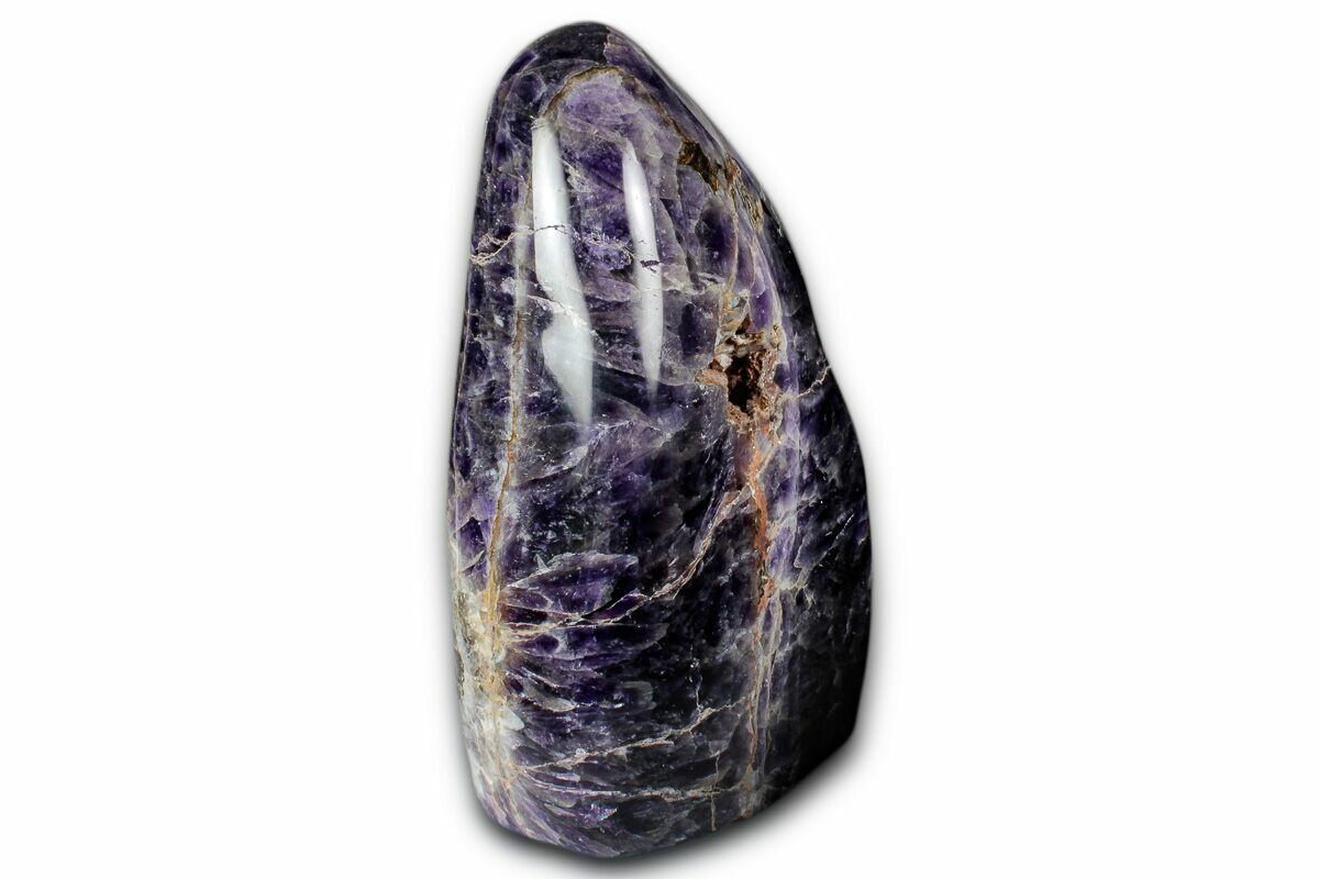 This is a beautiful, 5.95" tall, free-standing sculpture made from a deep-purple amethyst formation known as chevron amethyst. The bottom of the specimen has been cut flat so that it stands nicely on its own. This specimen was collected, cut, and polished in Madagascar. It has a natural pocket revealing a few exposed crystals.