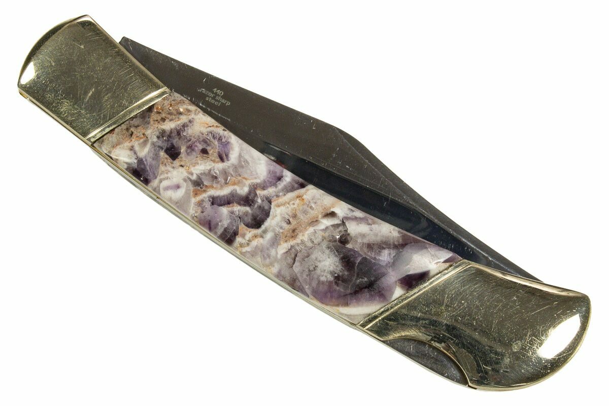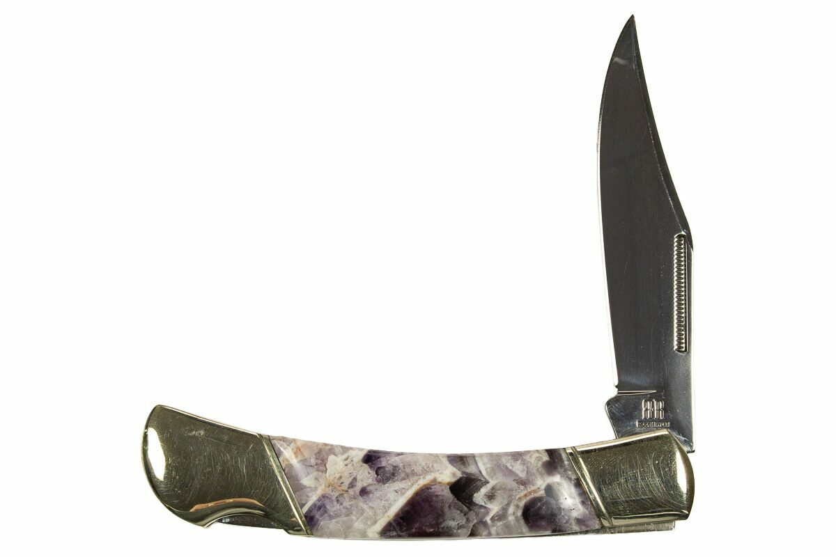 This handcrafted pocket knife is a striking fusion of fine craftsmanship and natural elegance. Made in Utah, it features artistic inlays of chevron amethyst—known for its vivid bands of deep purple and white quartz—set into a sleek, polished handle. Each piece of amethyst is carefully selected and fitted, creating a visually stunning, one-of-a-kind design that highlights the stone's natural beauty.
