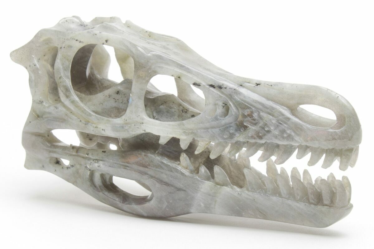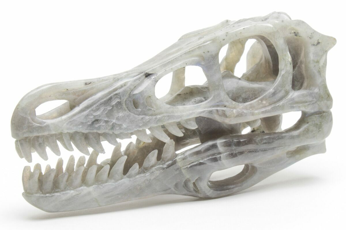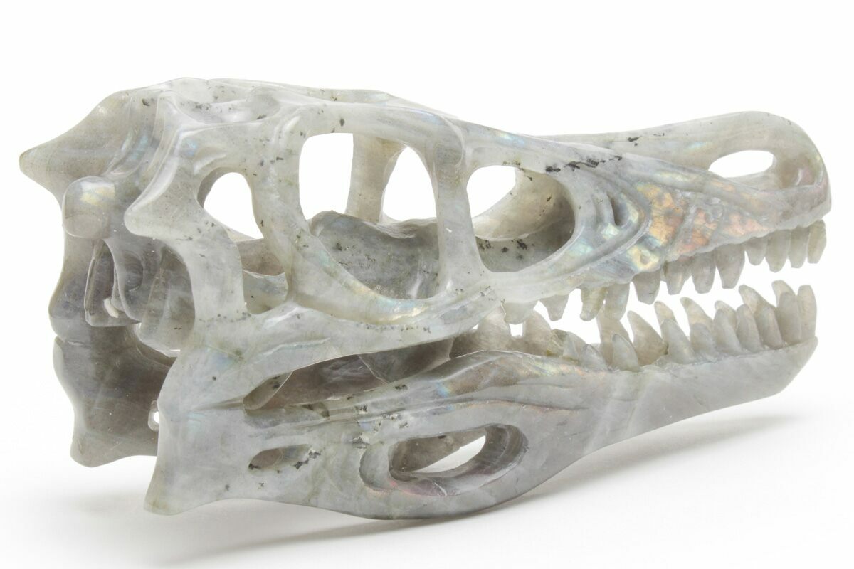 As if raptors weren't already mind-bogglingly awesome enough, we decided to add a whole other layer of intrigue and fantasy. This is a wild piece that is sure to excite any collector and is destined to be the envy of your social circle. What we have for you is an exquisitely-crafted, polished, 5" long raptor skull that's meticulously carved from labradorite. The brilliant blue, green, purple, and gold labradoresent colors dance in the light, giving this specimen an entirely different personality when viewed from different angles and lighting.