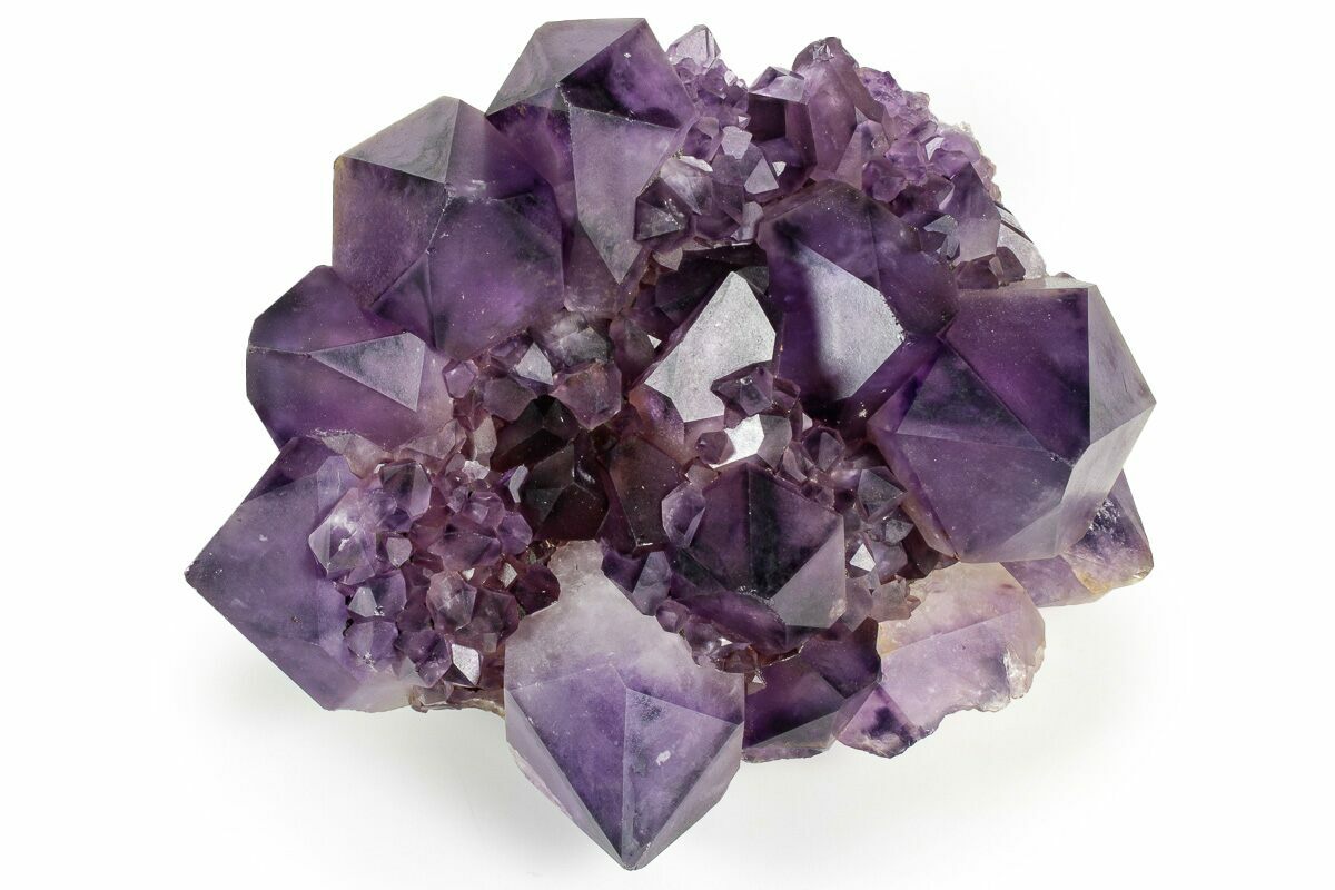 Amethyst clusters from the Democratic Republic of the Congo are renowned for their exceptionally dark, saturated purple color and their impressively large, well-formed crystals. Many Congolese clusters display deep violet to almost inky tones, often with excellent luster and sharp crystal terminations. Compared to amethyst from other localities, Congo material tends to have thicker, more robust crystal points that grow densely together, giving these clusters a bold, architectural presence that is especially prized for display.
