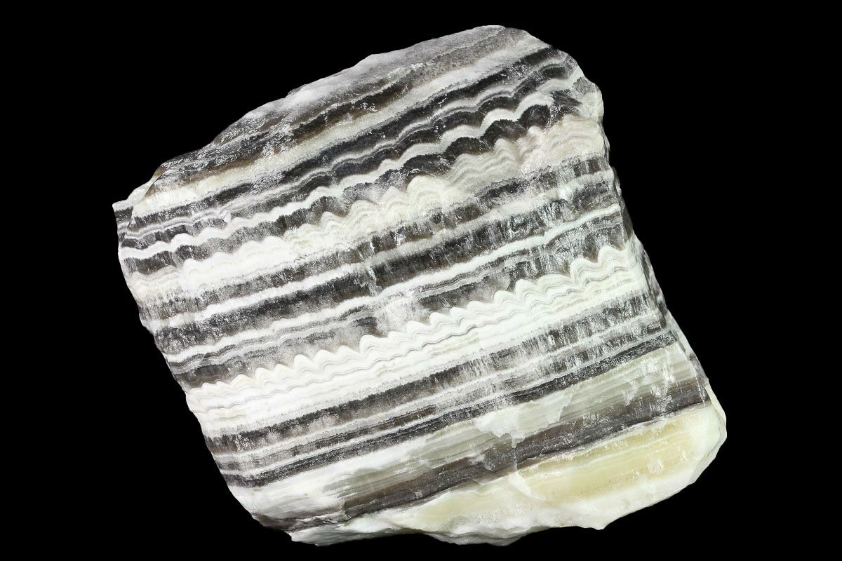 This is a 5" wide, free-standing banded zebra calcite section. It features alternating bands of black, brown, white and golden calcite/aragonite. It can be displayed in multiple orientations.